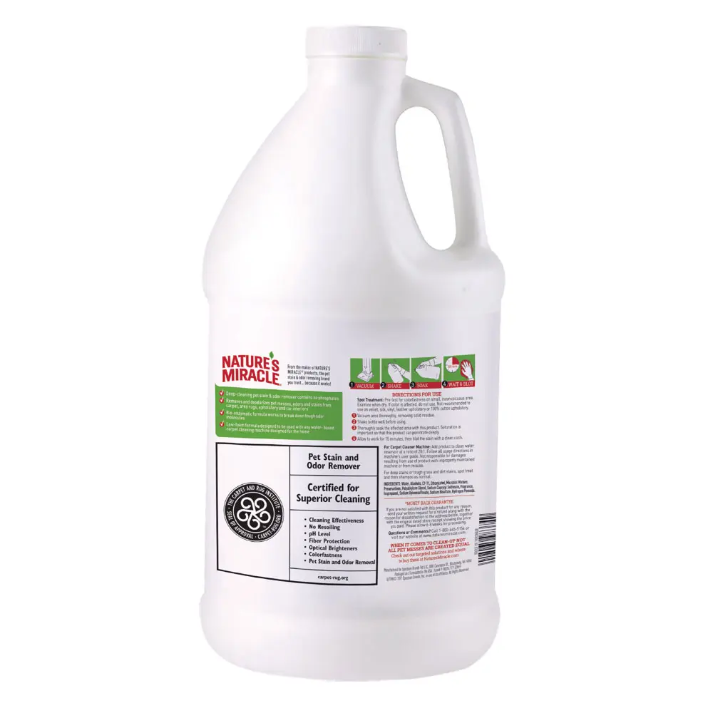 Accidents happen, as every pet owner knows. Nature's Miracle® Carpet Shampoo penetrates deep into carpet and upholstery fibers to remove deep-set pet stains and odors. This deep-cleaning stain and odor remover contains bio-enzymatic odor-locking technology for permanent odor removal. Use alone or with your steam or carpet cleaner – the low-foaming, professional-strength shampoo is designed to be used with any manufacturer’s water-based rug cleaning machine. Removes old and new stains and odors, keeping your carpet and upholstery looking new longer. Plus, our bottles are made with 25% Post-Consumer Recycled Material. Vacuum the area thoroughly, then use Nature's Miracle® Carpet Shampoo according to machine instructions. Clean carpeting and upholstery following your machine’s user guideDirections For Use
