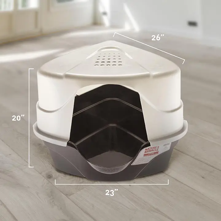 - HOODED CORNER LITTER BOX: Extra-large litter box with space-saving corner design features a charcoal filter that absorbs tough litter odor for up to three months.
