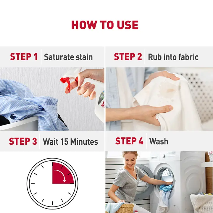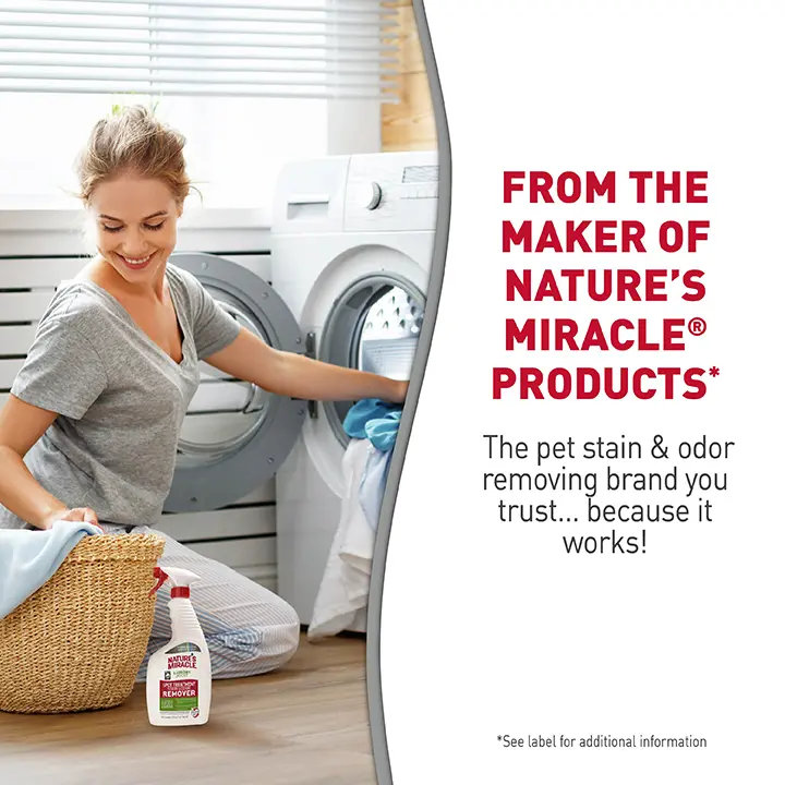 Nature’s Miracle® Laundry Boost Spot Treatment Stain and Odor Remover is formulated with bio-enzymatic technology which helps break down and destroy tough pet stains and odors, such as urine, feces, vomit, grass and drool. When used as directed, this formula helps remove tough pet stains and odors the first time. This laundry pre-wash stain and odor remover is powerful on stains but gentle on fabrics, so it’s perfect for use on clothing, pet beds and more*. Formulated without phosphates, parabens, sulfates and bleach, it’s safe for pets and home, when used as directed. Plus, Odor Capture 360™ technology provides an odor neutralizing system. And, our bottles are made with 25% Post-Consumer Recycled Material. Pre-treat fabrics before wash to penetrate, loosen and remove tough pet stains and odors. *Not for use on specialty fabrics, including washable silk, khaki, fluorescents, wool, suede and leathersDirections for Use