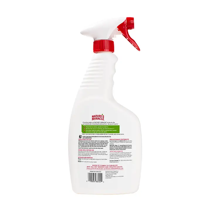 Before using, test surfaces to be treated for colorfastness by applying to a hidden area. Wait 5 minutes, then wipe with white cloth. If color is removed from the test area, do not use Simply Nature's Miracle Pet Stain & Odor Remover on those surfaces. Do not use on untreated hardwood, leather, suede, silk, wool specialty fabrics, unpolished ceramic or stone (polished and unpolished). Always use this product at full strength. Do not dilute. Always use Simply Nature's Miracle Pet Stain & Odor Remover products first. Other cleaners and detergents may fail and chemically set” stains that will be impossible to remove.Precautionary Statement