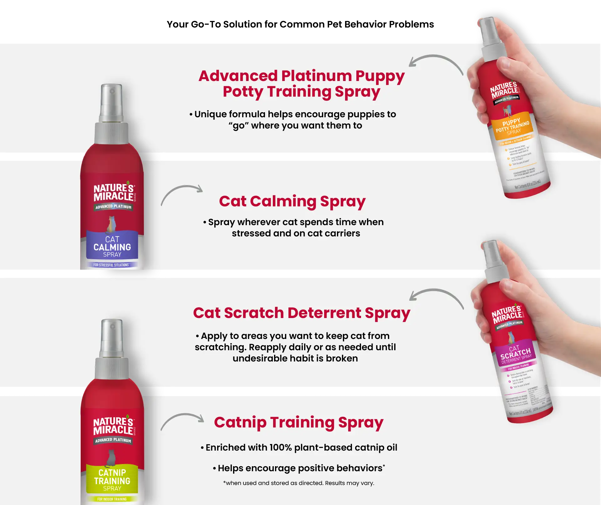 You love your pets, but you don't always love their behavior! From puppy potty training to cat scratch deterrent. Nature's Miracle product can help. when your furry friend needs a gentle correction, trust Nature's Miracle® training aids to make the job easier.